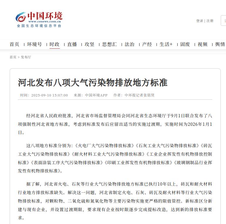 经河北省人民政府批准,河北省市场监督管理局会同河北省生态环境厅于9月1日联合发布了八项强制性河北省地方标准,考虑到标准发布后应留出适当的实施过渡期,实施时间为2026年1月1日。