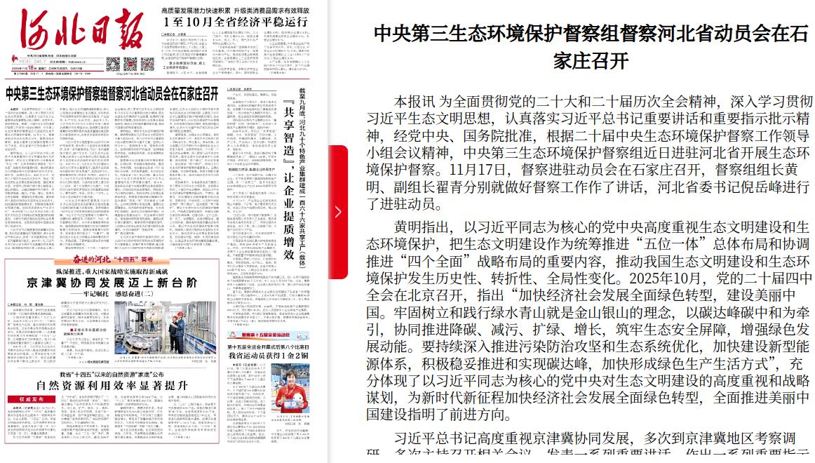 本报讯 为全面贯彻党的二十大和二十届历次全会精神,深入学习贯彻习近平生态文明思想,认真落实习近平总书记重要讲话和重要指示批示精神,经党中央、国务院批准,根据二十届中央生态环境保护督察工作领导小组会议精神,中央第三生态环境保护督察组近日进驻河北省开展生态环境保护督察。11月17日,督察进驻动员会在石家庄召开,督察组组长黄明、副组长翟青分别就做好督察工作作了讲话,河北省委书记倪岳峰进行了进驻动员。