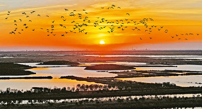 2024年7月,河北沧州南大港候鸟栖息地作为中国黄(渤)海候鸟栖息地(第二期)的组成部分,被列入《世界遗产名录》。图为2024年10月20日清晨,沧州南大港湿地和鸟类自然保护区内群鸟翱翔、景色迷人。 河北日报供图