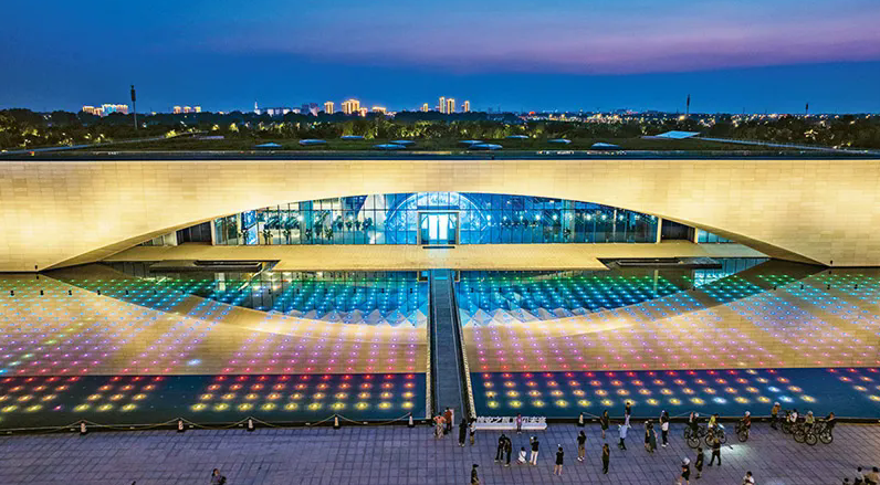 雄安城市计算中心作为雄安“城市大脑”,是新区数字化建设的重要基础设施。远远望去,被点亮的城市计算中心拱形东立面与水面中的倒影融合,就像美丽灵动的“大眼睛”,因而得名“雄安之眼”。图为2024年7月26日夜晚,无人机拍摄的雄安城市计算中心。 河北日报供图