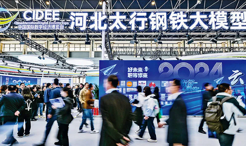 河北39家钢铁企业携手华为等13家人工智能企业,共同研发钢铁领域基础大模型,赋能钢铁行业高质量发展。图为2024年10月24日,在石家庄举办的2024中国国际数字经济博览会上,河北太行钢铁大模型展区吸引了众多参观者。 河北日报供图