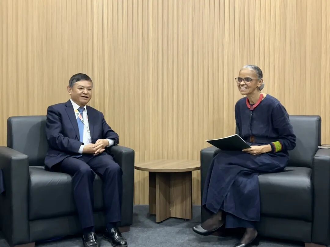 在会见玛丽娜·席尔瓦时,黄润秋介绍了近年来中国生态环境保护政策与行动,以及碳市场建设、适应气候变化等工作开展情况,表示将全力支持巴方办好COP30,期待同巴方深化环境与气候领域合作,助力新时代中巴关系发展。玛丽娜·席尔瓦感谢中方对巴方在举办COP30等方面的大力支持,期待与中方携手为推进全球环境与气候治理作出更大贡献。