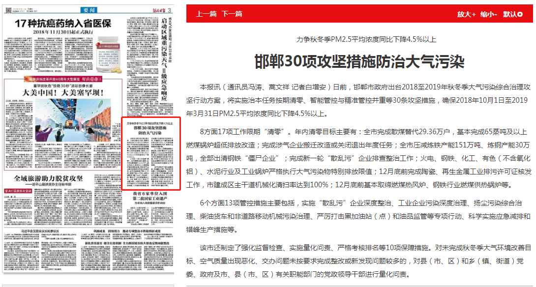 本报讯(通讯员冯涛、蒿文祥 记者白增安)日前,邯郸市政府出台2018至2019年秋冬季大气污染综合治理攻坚行动方案,将实施治本任务按期清零、智能管控与精准管控并重等30条攻坚措施,确保2018年10月1日至2019年3月31日PM2.5平均浓度同比下降4.5%以上。