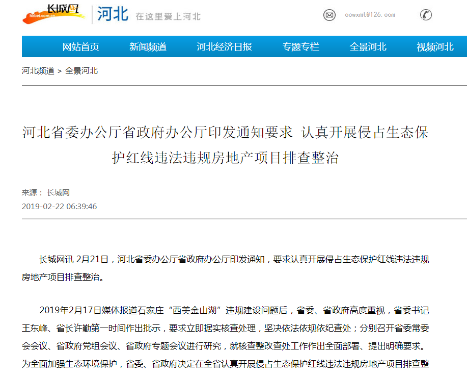 2019年2月17日媒体报道石家庄“西美金山湖”违规建设问题后,省委、省政府高度重视,省委书记王东峰、省长许勤第一时间作出批示,要求立即据实核查处理,坚决依法依规依纪查处;分别召开省委常委会会议、省政府党组会议、省政府专题会议进行研究,就核查整改查处工作作出全面部署、提出明确要求。为全面加强生态环境保护,省委、省政府决定在全省认真开展侵占生态保护红线违法违规房地产项目排查整治。