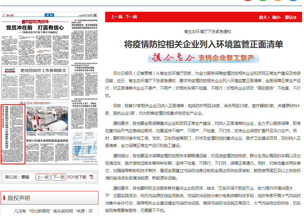 河北日报讯(记者贾楠)从省生态环境厅获悉,为全力服务保障疫情防控相关企业和项目正常生产建设及物资运输,近日,省生态环境厅下发紧急通知,要求将疫情防控相关企业列入环境监管正面清单,全面保障正常生产运行,对正面清单内企业不停产、不限产;对相关车辆不检查、不限行;对相关企业项目“隔空服务”不检查、不打扰。