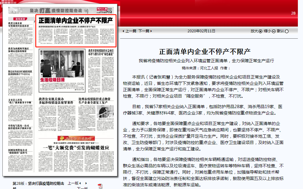本报讯(记者张莉慧)为全力服务保障疫情防控相关企业和项目正常生产建设及物资运输,近日,省生态环境厅下发紧急通知,要求将疫情防控相关企业列入环境监管正面清单,全面保障正常生产运行,对正面清单内企业不停产、不限产;对相关车辆不检查、不限行;对相关企业项目“隔空服务”,不检查、不打扰。