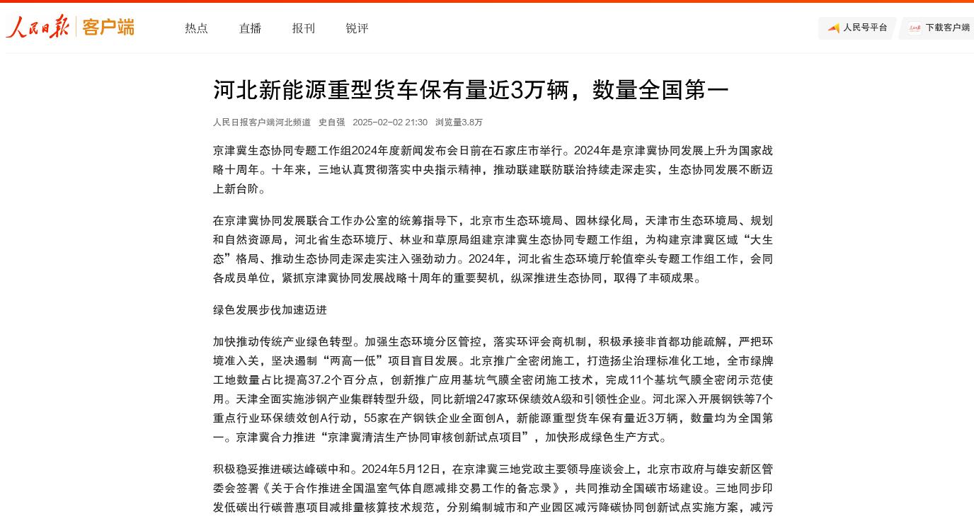 人民日报客户端:河北新能源重型货车保有量近3万辆,数量全国第一