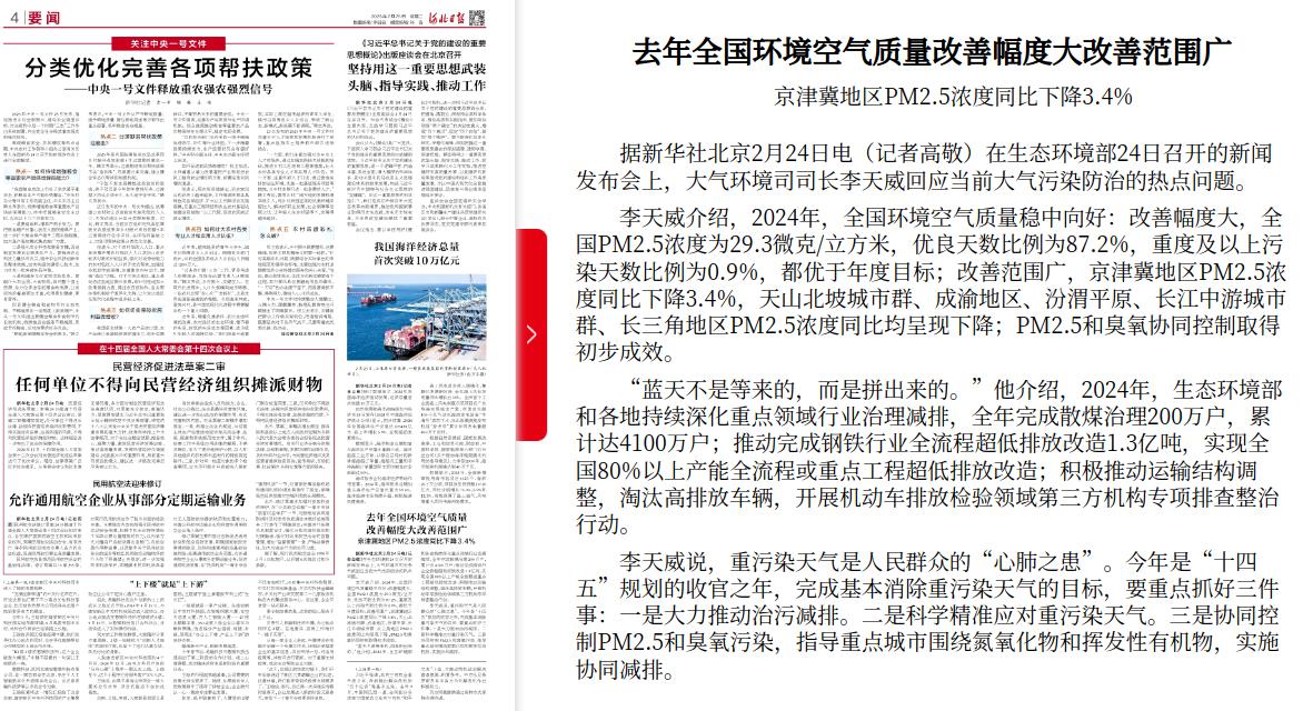 河北日报:去年全国环境空气质量改善幅度大改善范围广 京津冀地区PM2.5浓度同比下降3.4%