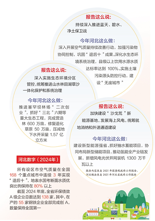 天更蓝、地更绿、水更清,我省生态环境持续改善。去年,所有设区市空气质量在全国168个重点城市中连续3年实现“退后十”,地表水国考断面水质优良比例保持在80%以上,地下水开采量压减1.77亿立方米,营造林638万亩。沧州南大港候鸟栖息地入选世界自然遗产名录。河北发展的绿色底色更加亮丽。