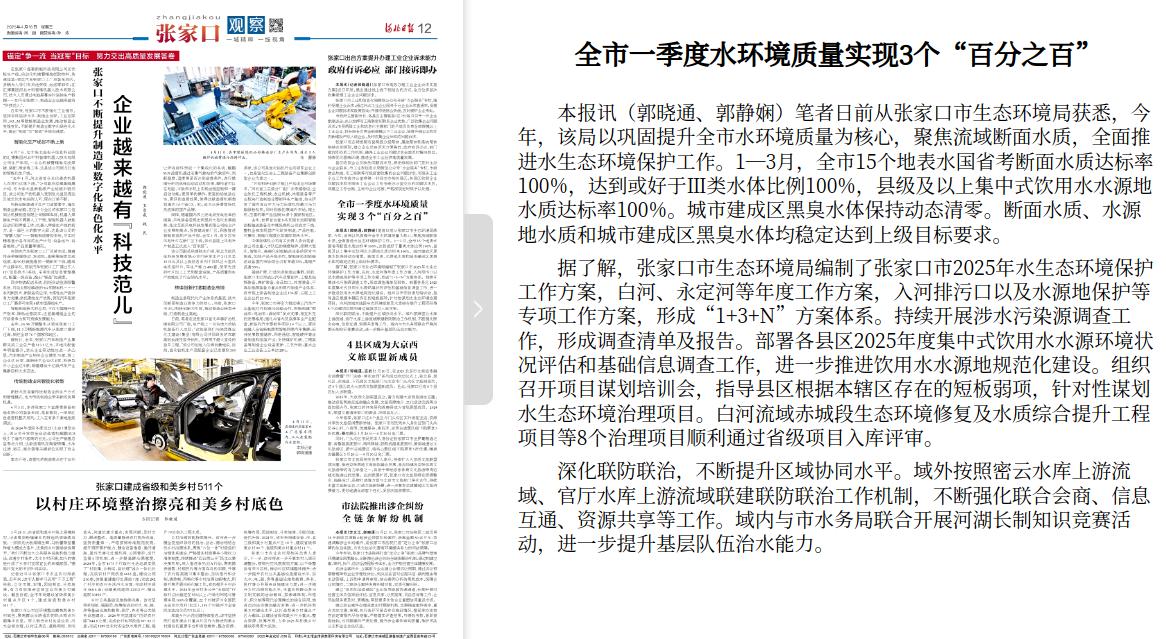 河北日报:张家口观察:全市一季度水环境质量实现3个“百分之百”