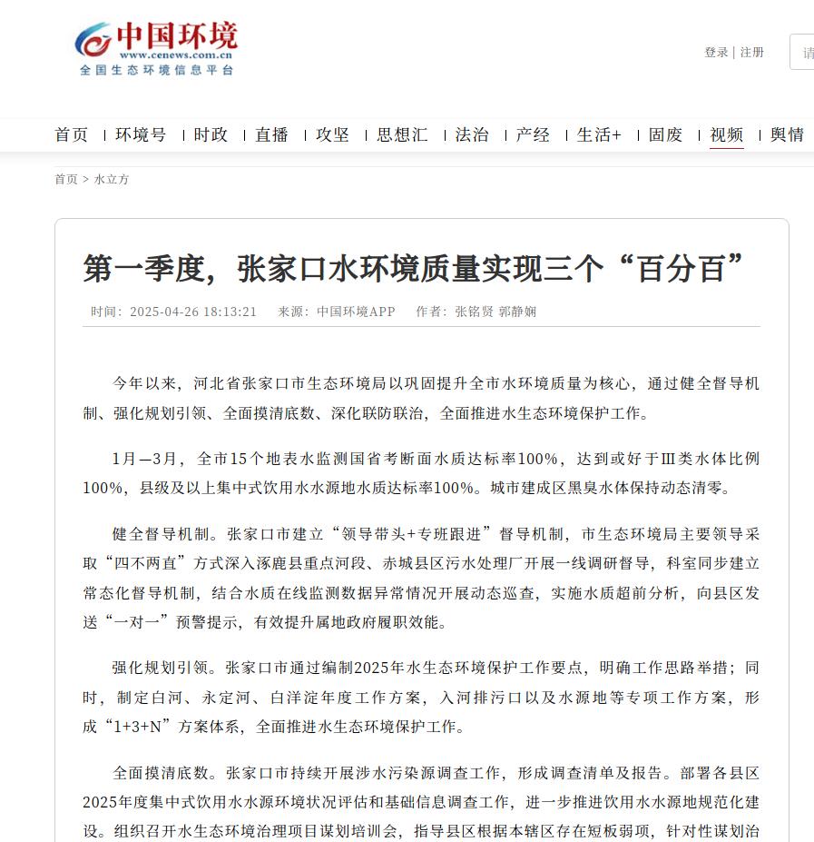 中国环境客户端:第一季度,张家口水环境质量实现三个“百分百”
