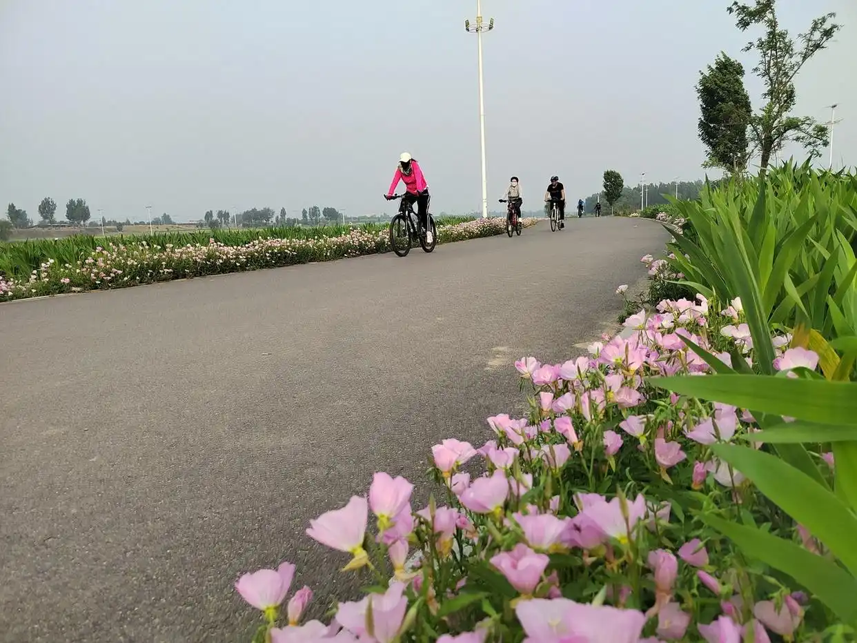 5月21日,自行车骑行者在河北省新乐市木刀沟环绕公路游玩骑行。小满时节的新乐市木刀沟河,只见花草遍野,树木郁郁葱葱,河水碧波荡漾。