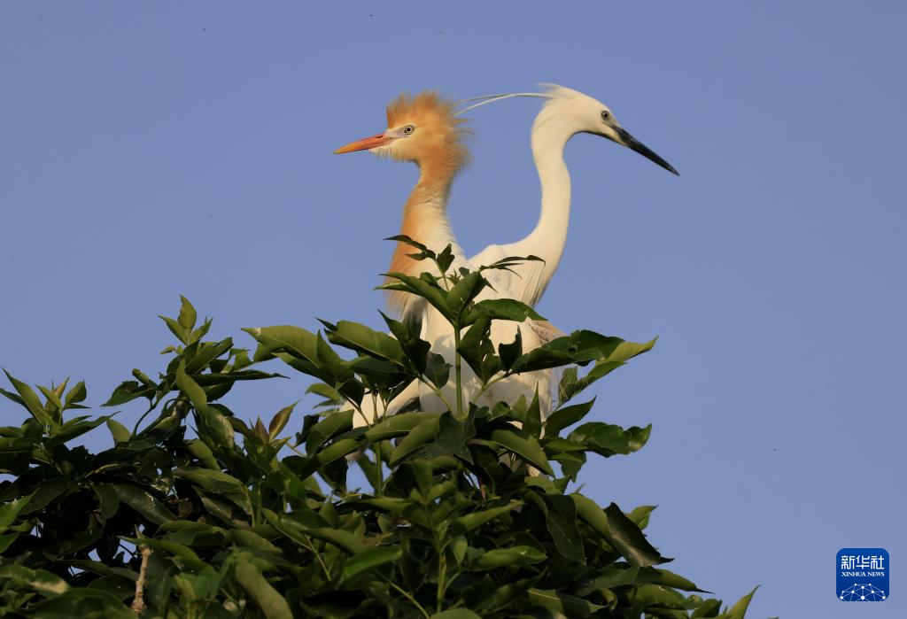 5月24日,一只白鹭(右)和一只牛背鹭在唐山市丰南区沿海林地树上休息。近日,河北省唐山市丰南区生态环境优良的沿海林地吸引了大批白鹭、牛背鹭、夜鹭和苍鹭等鹭科鸟类在此栖息繁衍,绘就出一幅幅优美和谐的生态画卷。新华社记者 杨世尧 摄