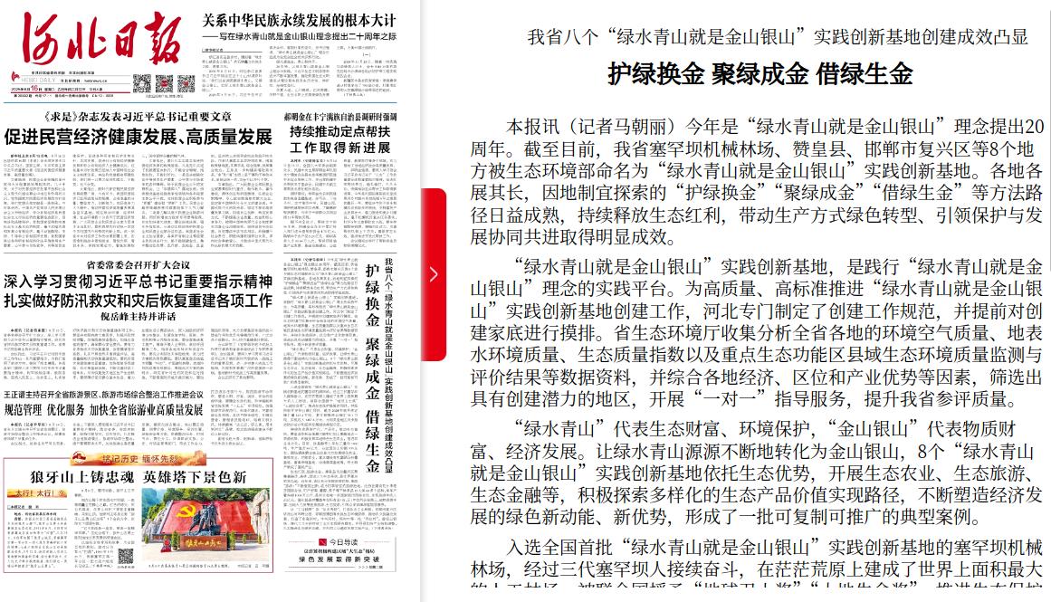 河北日报:我省八个“绿水青山就是金山银山”实践创新基地创建成效凸显 护绿换金 聚绿成金 借绿生金