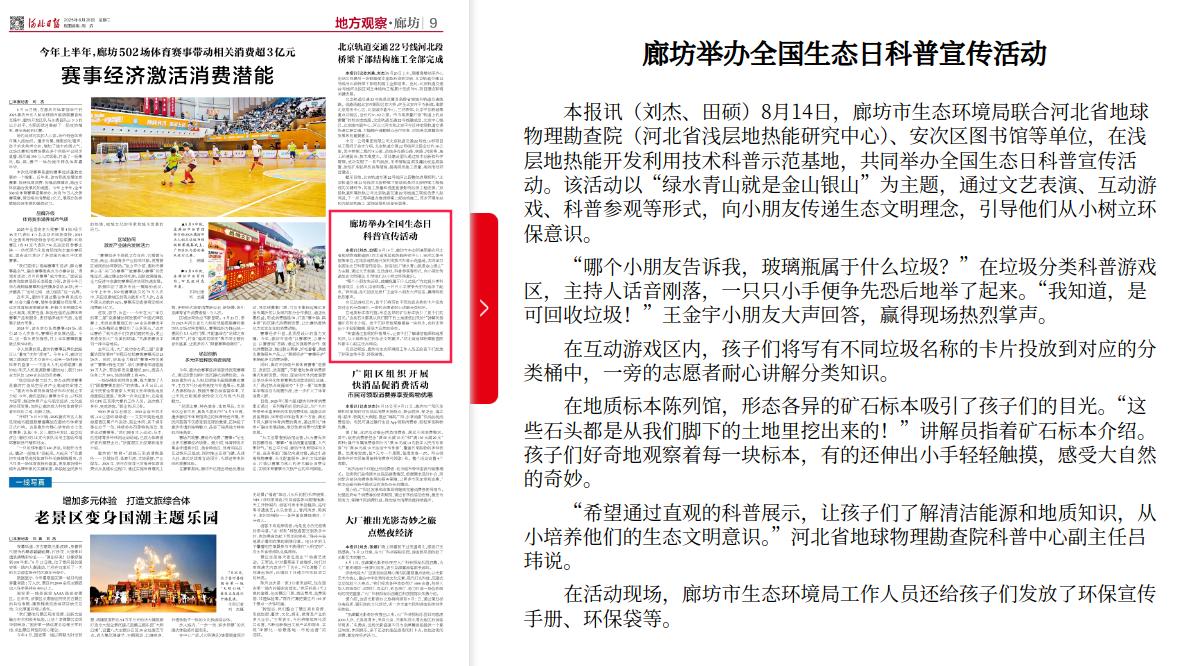 本报讯(刘杰、田硕)8月14日,廊坊市生态环境局联合河北省地球物理勘查院(河北省浅层地热能研究中心)、安次区图书馆等单位,在浅层地热能开发利用技术科普示范基地,共同举办全国生态日科普宣传活动。该活动以“绿水青山就是金山银山”为主题,通过文艺表演、互动游戏、科普参观等形式,向小朋友传递生态文明理念,引导他们从小树立环保意识。