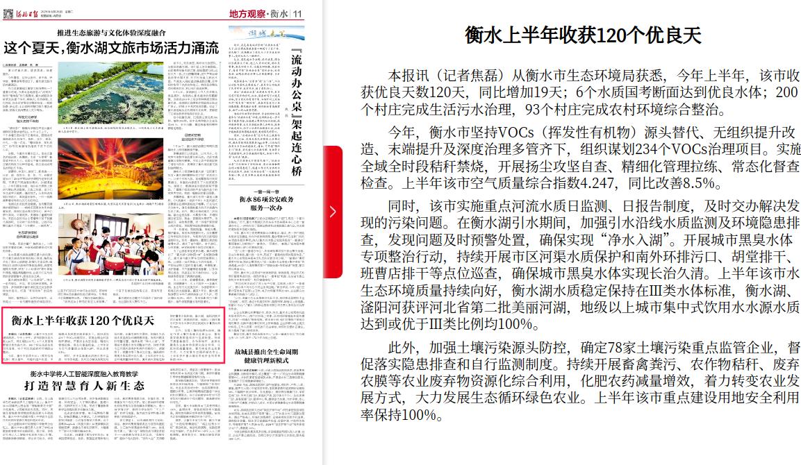 本报讯(记者焦磊)从衡水市生态环境局获悉,今年上半年,该市收获优良天数120天,同比增加19天;6个水质国考断面达到优良水体;200个村庄完成生活污水治理,93个村庄完成农村环境综合整治。