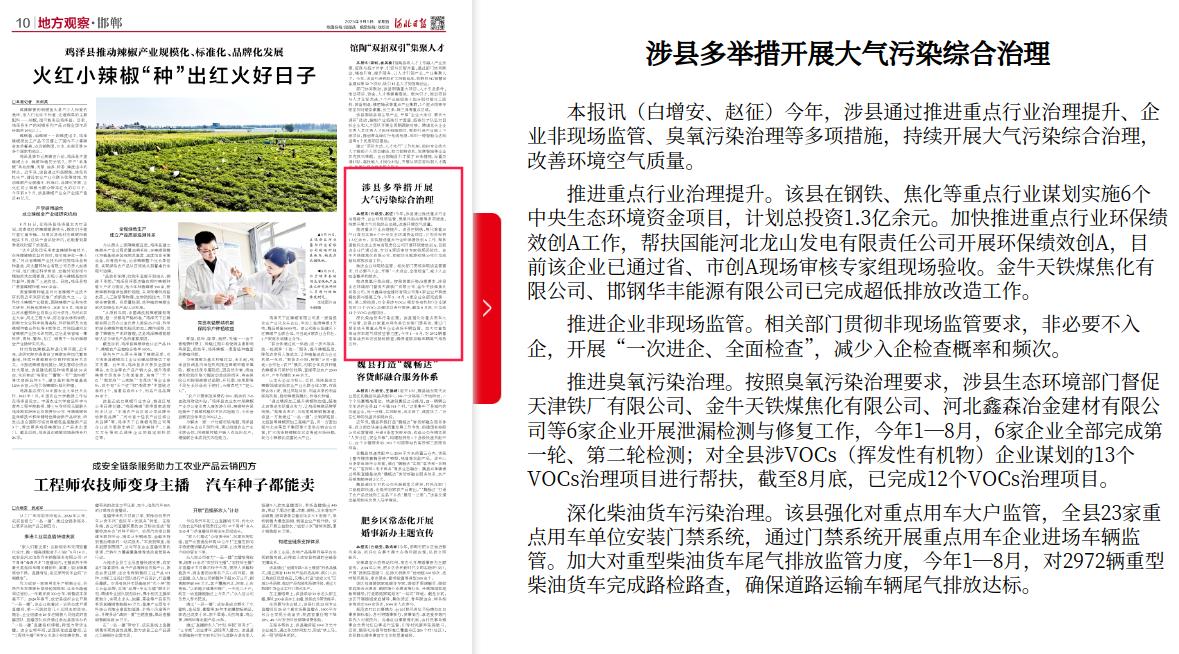 推进臭氧污染治理。按照臭氧污染治理要求,涉县生态环境部门督促天津铁厂有限公司、金牛天铁煤焦化有限公司、河北鑫森冶金建材有限公司等6家企业开展泄漏检测与修复工作,今年1—8月,6家企业全部完成第一轮、第二轮检测;对全县涉VOCs(挥发性有机物)企业谋划的13个VOCs治理项目进行帮扶,截至8月底,已完成12个VOCs治理项目。