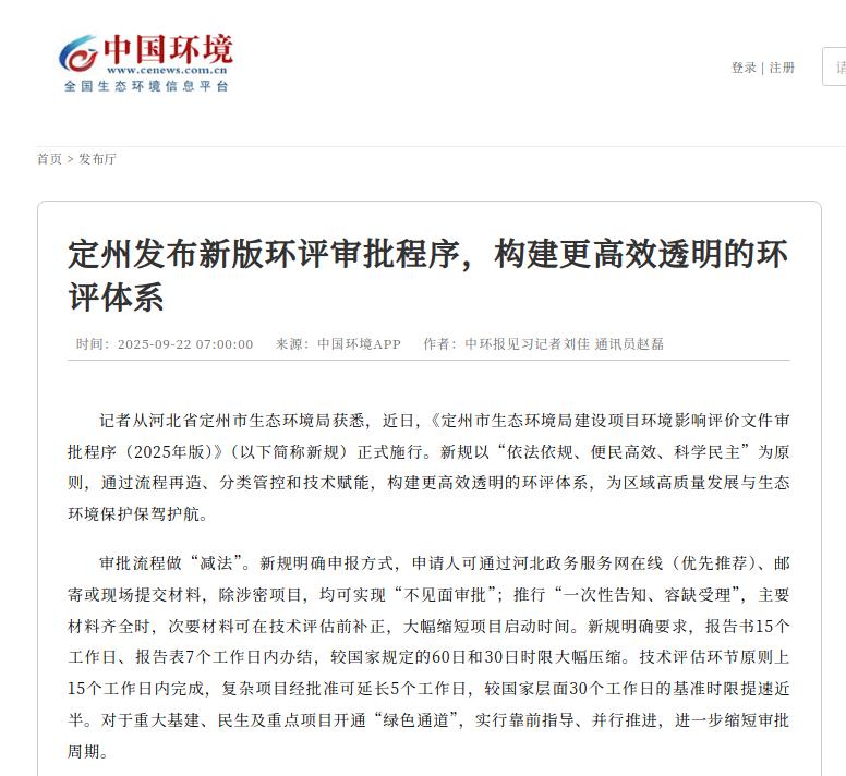 中国环境客户端:定州发布新版环评审批程序,构建更高效透明的环评体系