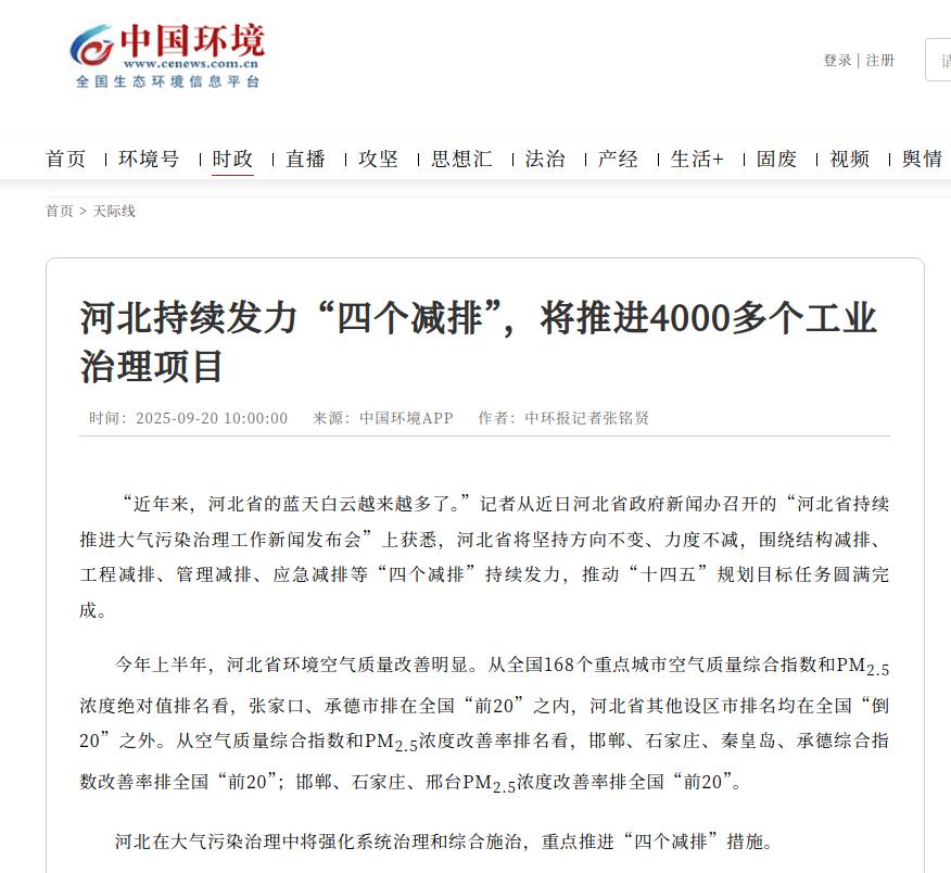 中国环境客户端:河北持续发力“四个减排”,将推进4000多个工业治理项目