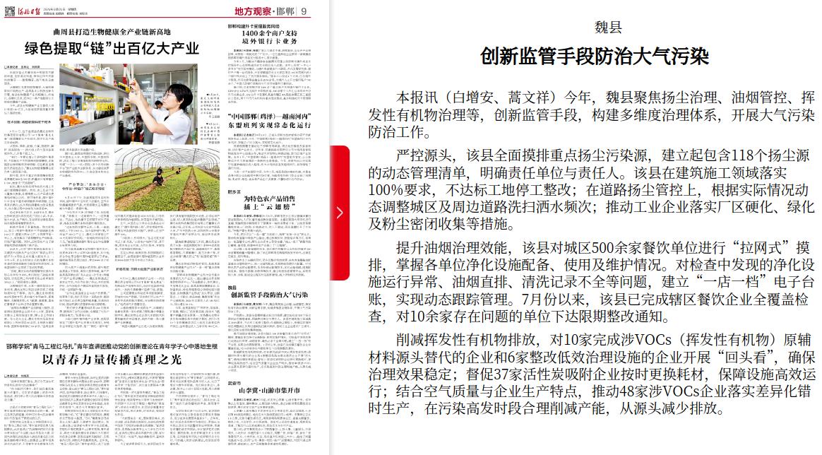 本报讯(白增安、蒿文祥)今年,魏县聚焦扬尘治理、油烟管控、挥发性有机物治理等,创新监管手段,构建多维度治理体系,开展大气污染防治工作。
