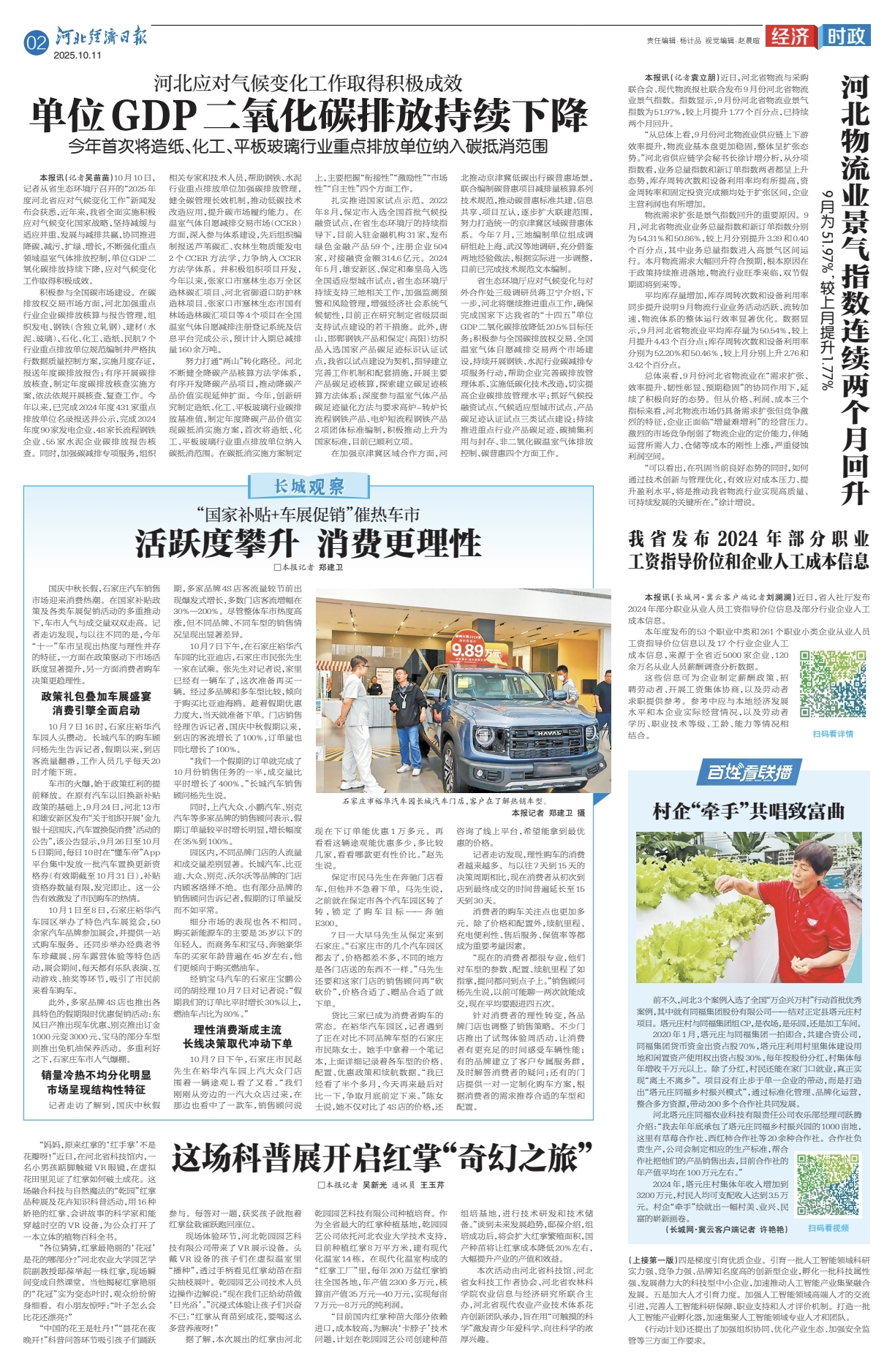 在加强京津冀区域合作方面,河北推动京津冀低碳出行碳普惠场景, 联合编制碳普惠项目减排量核算系列 技术规范,推动碳普惠标准共建、信息 共享、项目互认,逐步扩大联建范围, 努力打造统一的京津冀区域碳普惠体 系。今年7月,三地编制单位组成调 研组赴上海、武汉等地调研,充分借鉴 两地经验做法,根据实际进一步调整, 目前已完成技术规范文本编制。 省生态环境厅应对气候变化与对 外合作处三级调研员蒋卫宁介绍,下 一步,河北将继续推进重点工作,确保 完成国家下达我省的“十四五”单位 GDP二氧化碳排放降低20.5%目标任 务;积极参与全国碳排放权交易、全国 温室气体自愿减排交易两个市场建 设,持续开展钢铁、水泥行业碳减排专 项服务行动,帮助企业完善碳排放管 理体系、实施低碳化技术改造,切实提 高企业碳排放管理水平;抓好气候投 融资试点、气候适应型城市试点、产品 碳足迹认证试点三类试点建设;持续 推进重点行业产品碳足迹、碳捕集利 用与封存、非二氧化碳温室气体排放 控制、碳普惠四个方面工作。
