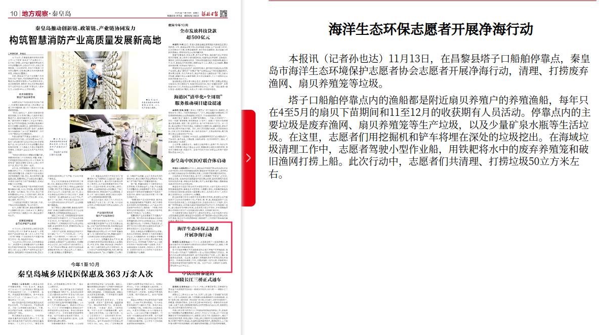 本报讯(记者孙也达)11月13日,在昌黎县塔子口船舶停靠点,秦皇岛市海洋生态环境保护志愿者协会志愿者开展净海行动,清理、打捞废弃渔网、扇贝养殖笼等垃圾。