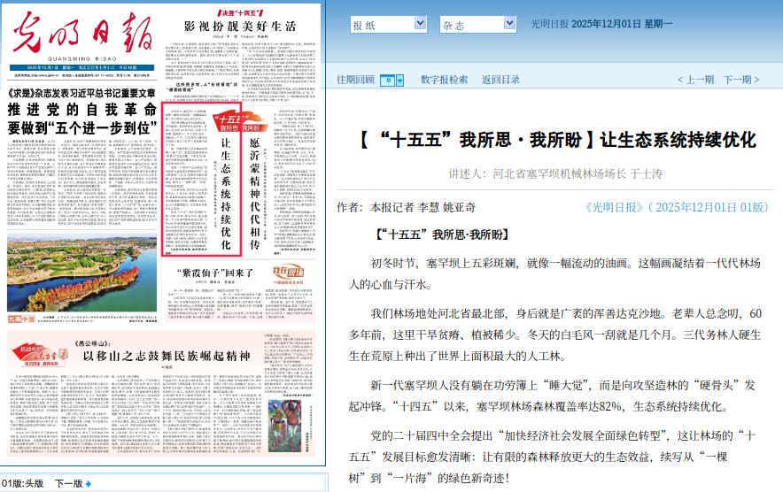 党的二十届四中全会提出“加快经济社会发展全面绿色转型”,这让林场的“十五五”发展目标愈发清晰:让有限的森林释放更大的生态效益,续写从“一棵树”到“一片海”的绿色新奇迹!