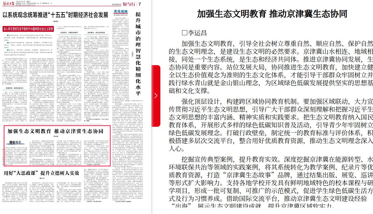 河北日报:加强生态文明教育 推动京津冀生态协同