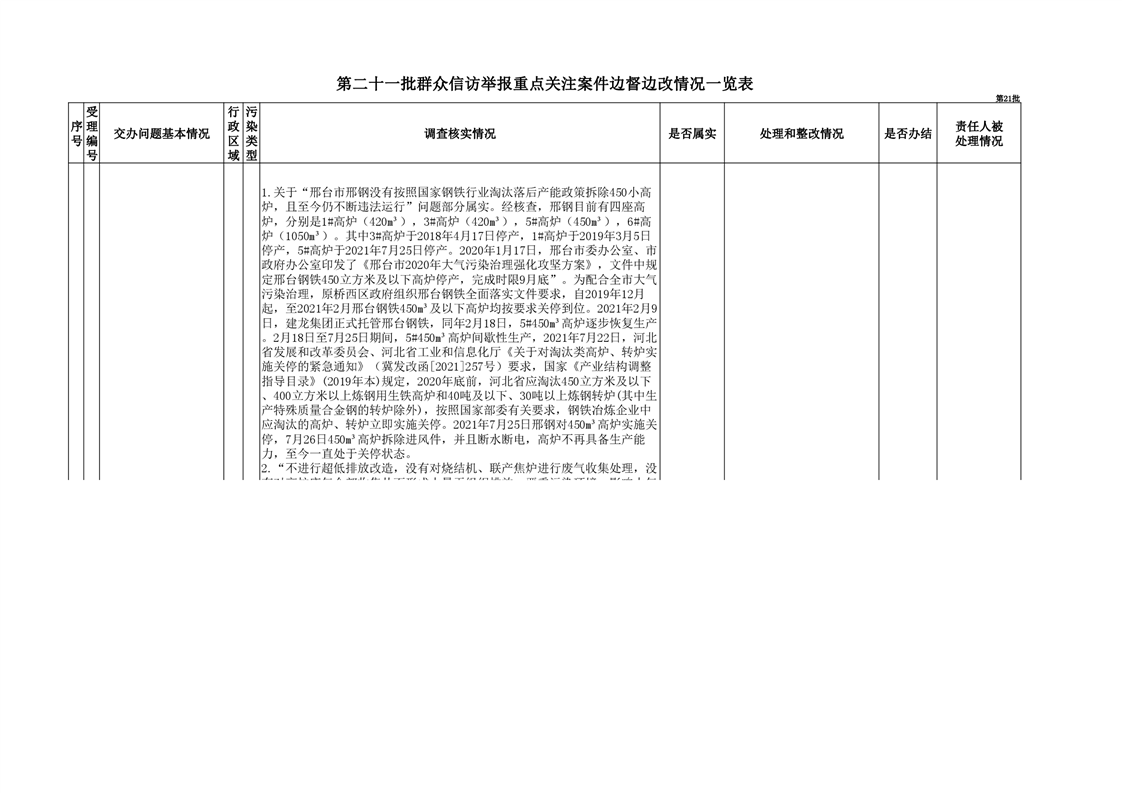第二十一批群众信访举报重点关注案件边督边改情况一览表