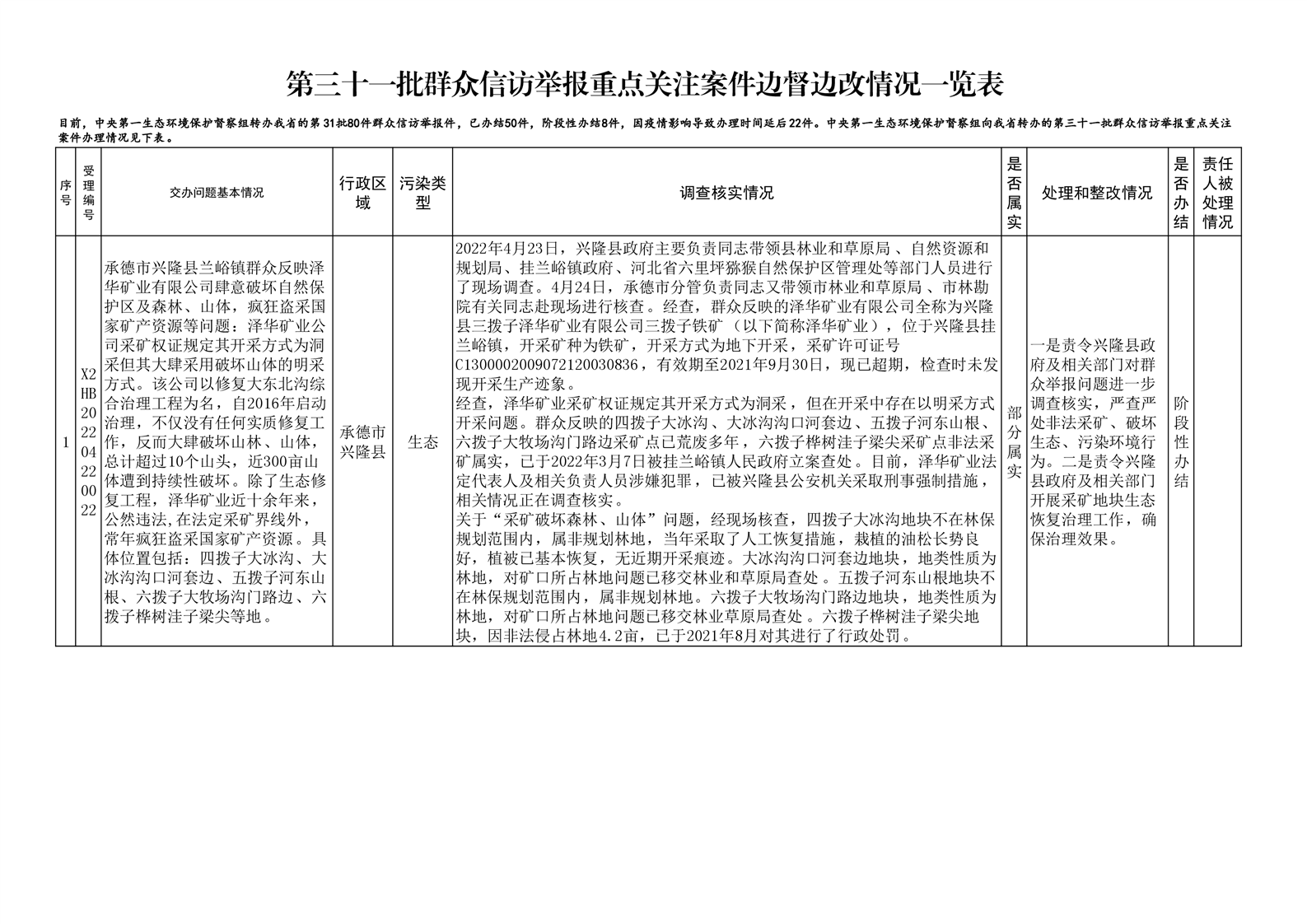 第三十一批群众信访举报重点关注案件边督边改情况一览表