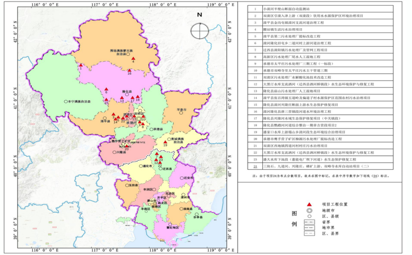 图3:2021-2023年度引滦入津上下游横向生态补偿资金承德、唐山支持项目分布图