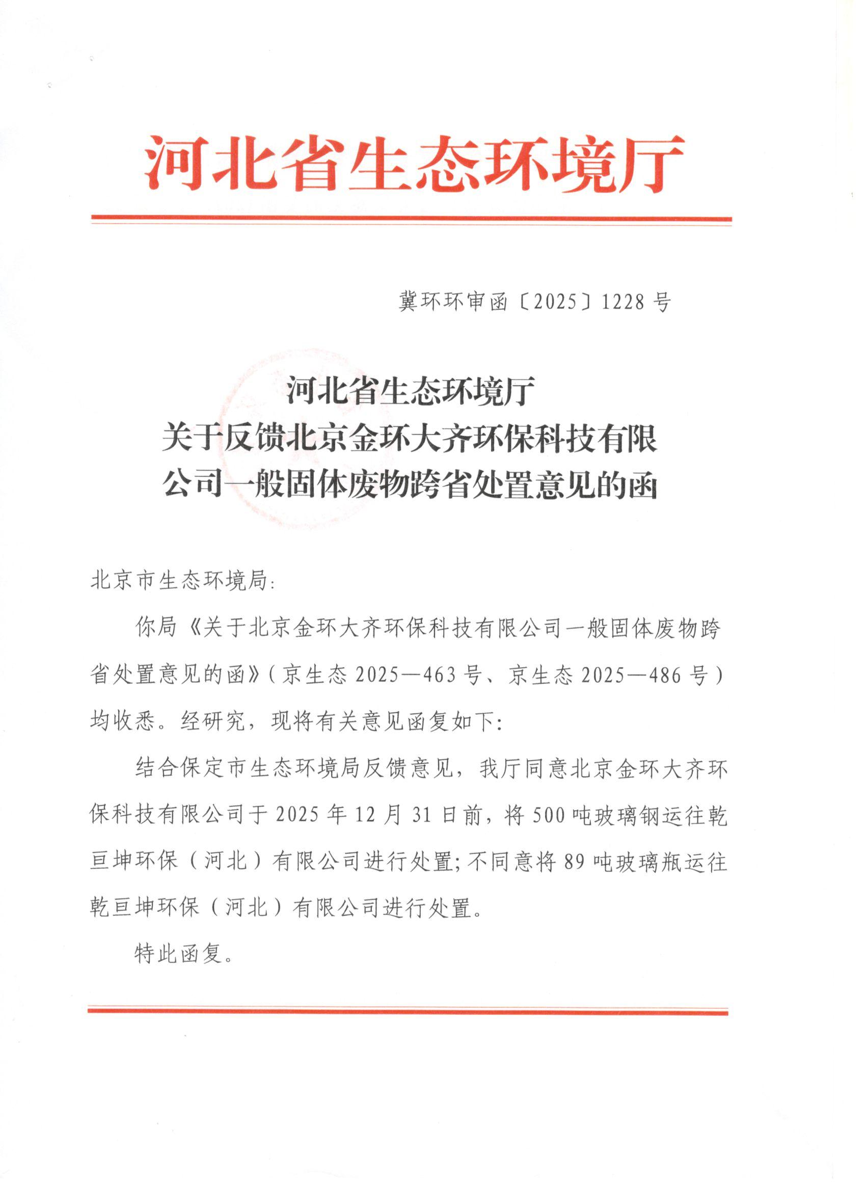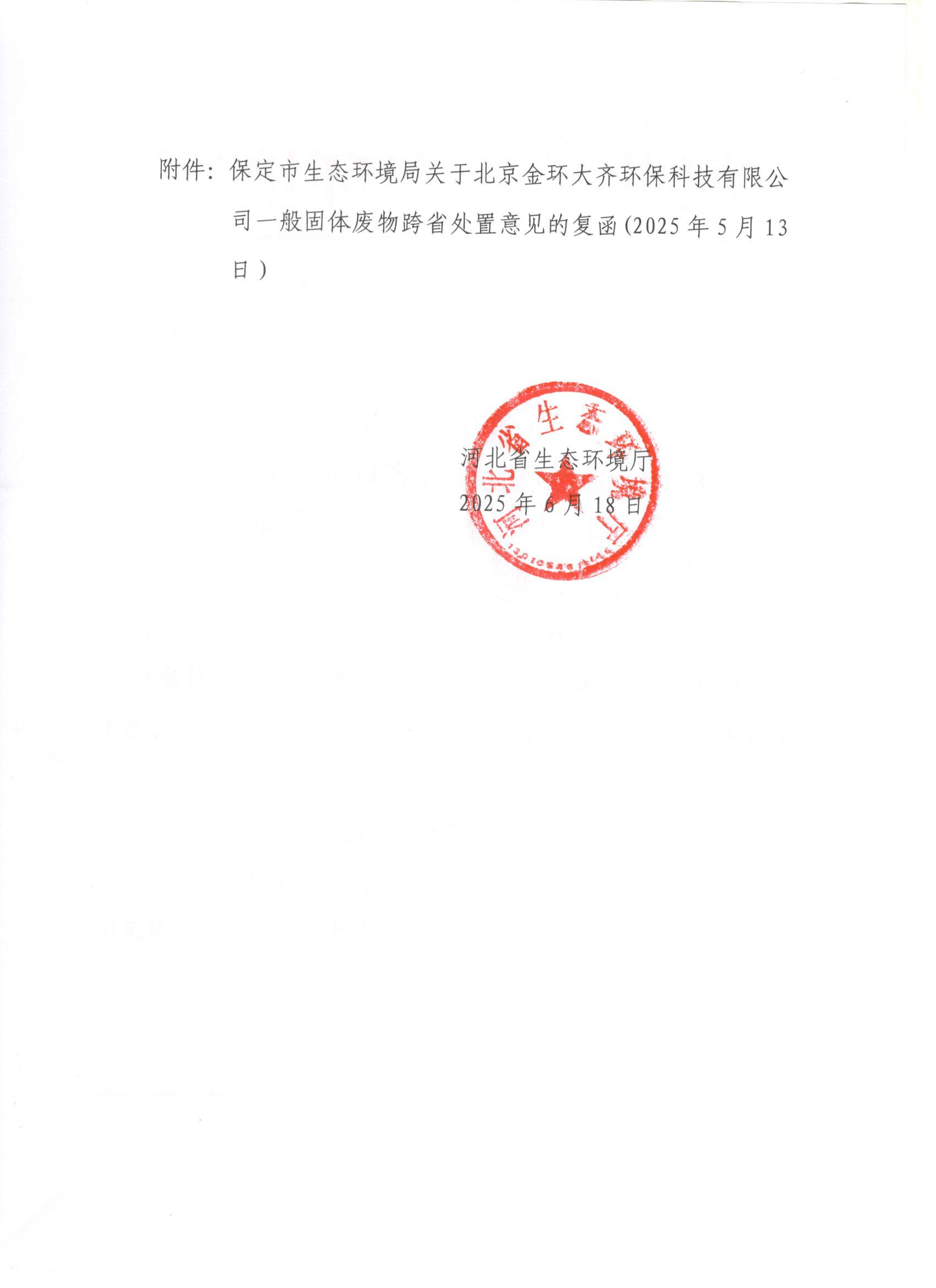 关于反馈北京金环大齐环保科技有限公司一般固体废物跨省处置意见的函