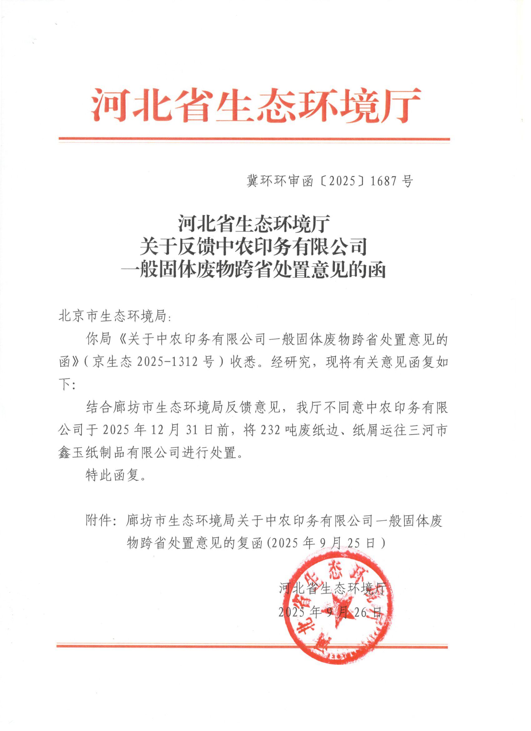 关于反馈中农印务有限公司一般固体废物跨省处置意见的函