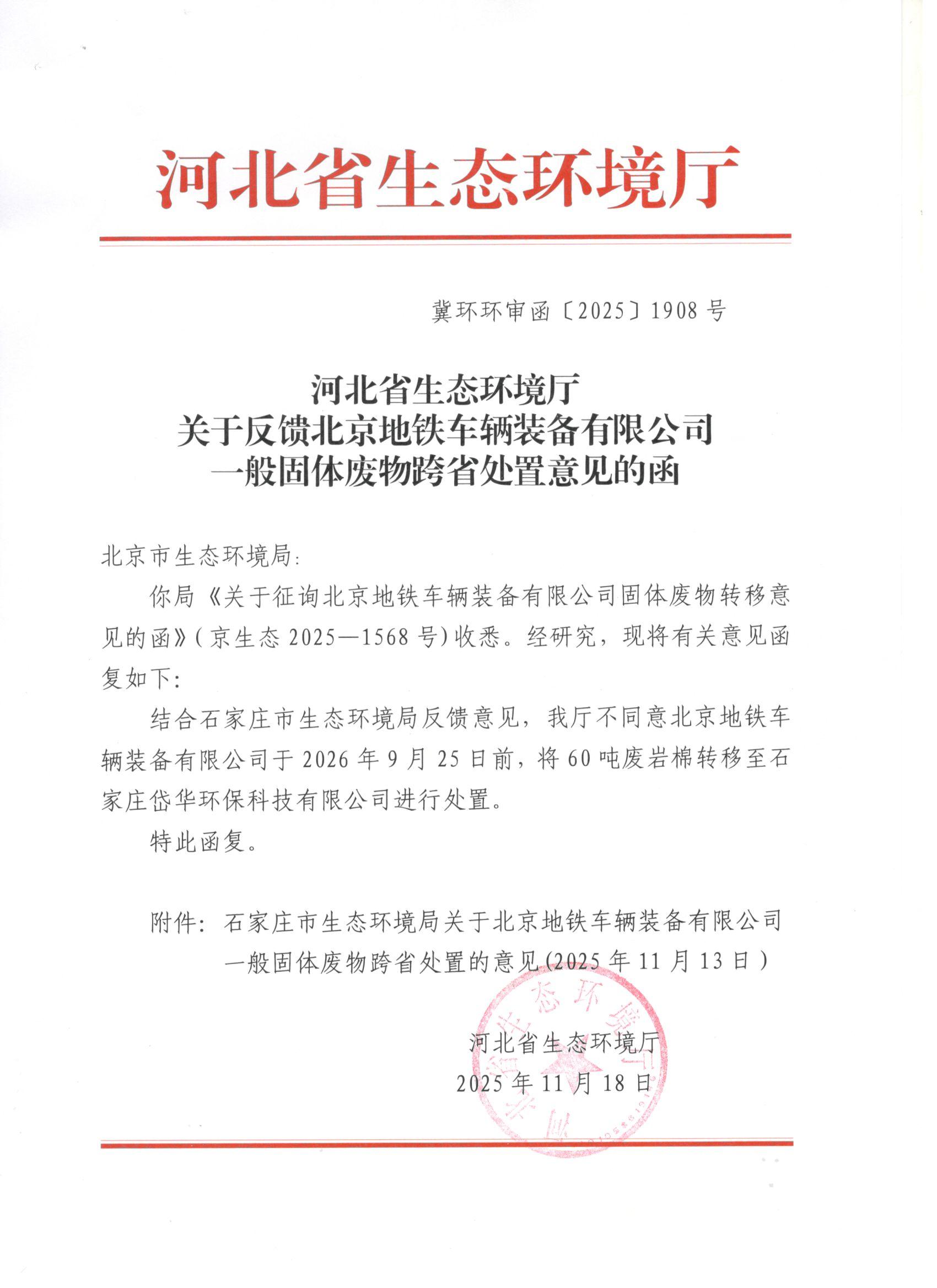 关于反馈北京地铁车辆装备有限公司一般固体废物跨省处置意见的函