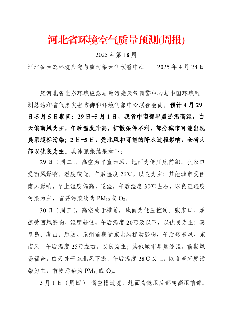 河北省空气质量预测报告(周报)2025年第18周
