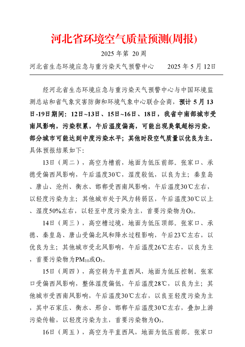 河北省空气质量预测报告(周报)2025年第20周