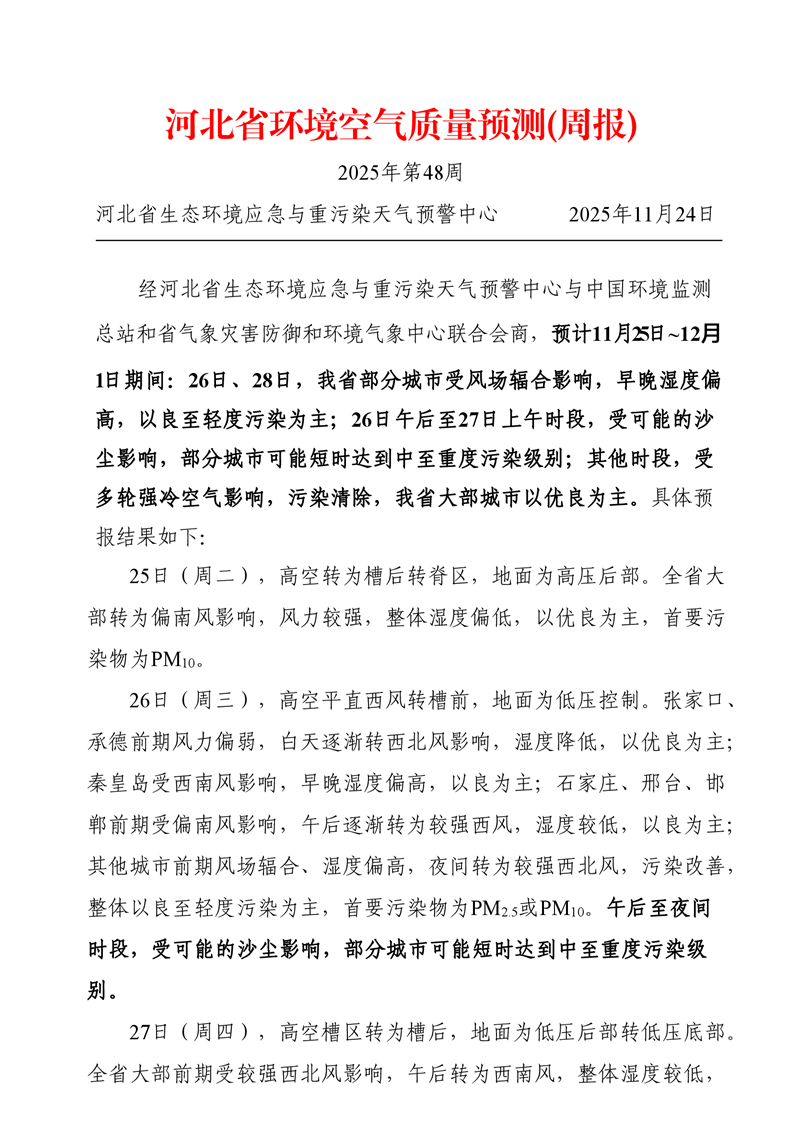 河北省空气质量预测报告(周报)2025年第48周